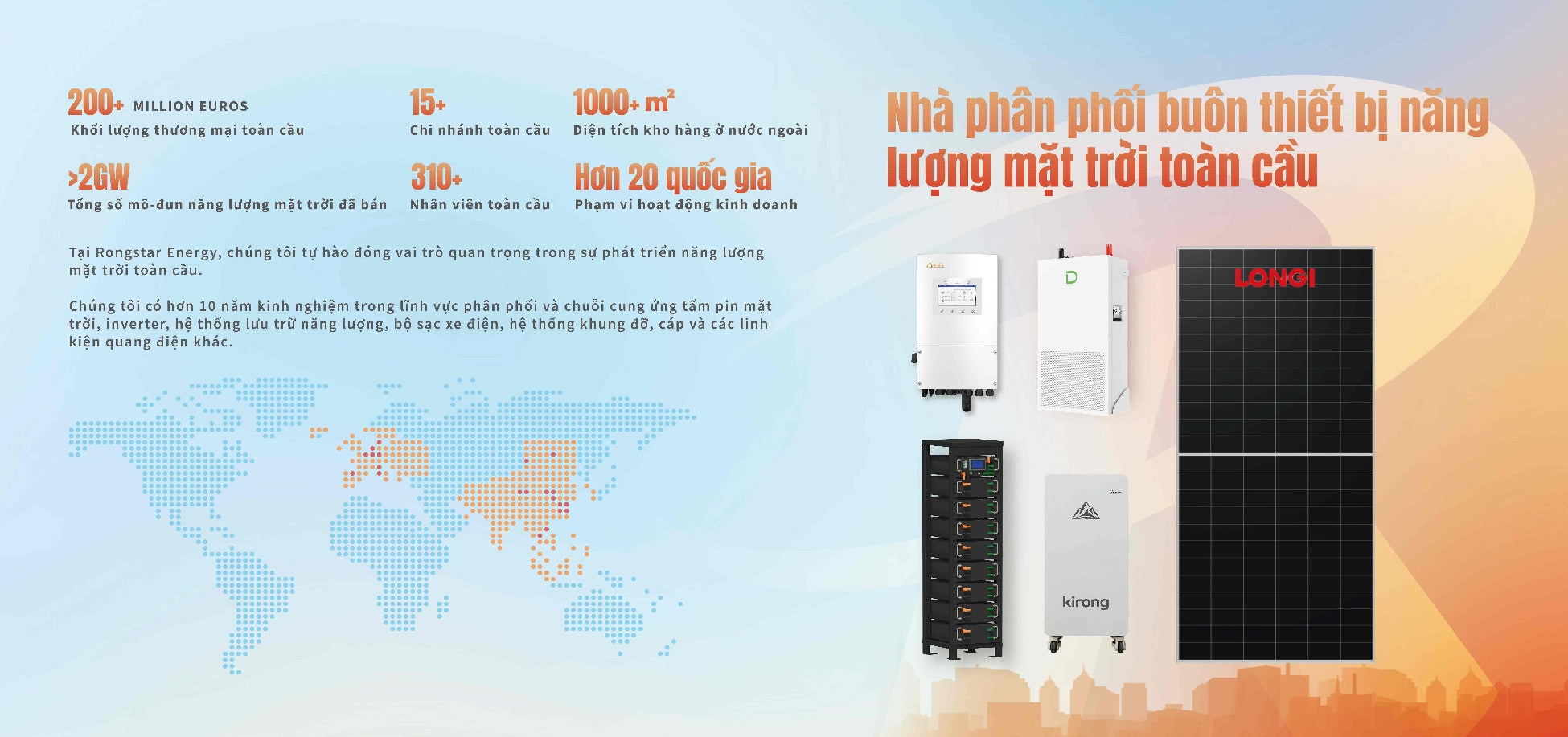 Rongstar Energy Vietnam là đại diện của Rongstar Group tại thị trường Việt Nam – một thương hiệu toàn cầu chuyên cung cấp giải pháp và thiết bị năng lượng mặt trời đến từ các nhà sản xuất uy tín hàng đầu thế giới.